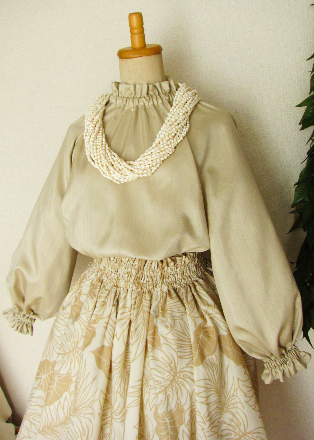 | かぶって着る、ゆったりタイプのブラウス アウアナにも、カヒコにも お使いいただけると思います えりぐりはゴムで調節可能 フィットさせて着ることができ、 あらたまった雰囲気の見ために えりの幅はご希望のcmでおつくりできるので 幅を広くして、しっかり立てて 逆に狭くすると、ひかえめな感じに サイズは、MとL ご試着いただいて、 さらに大きくもおつくりできます ケイキサイズもあるので、親子おそろい、 ハラウの皆様でご一緒、なども可能です 通常は、無地生地 (綿とポリエステルの混紡生地. 薄手で軽く、シワになっても戻りやすい)、 ひかえめな光沢のバックサテンシャンタンで でおつくりしています 無地全色のリストはこちらから バックサテンシャンタンのページはこちらから ケイキ用はこちらから ![]() |
