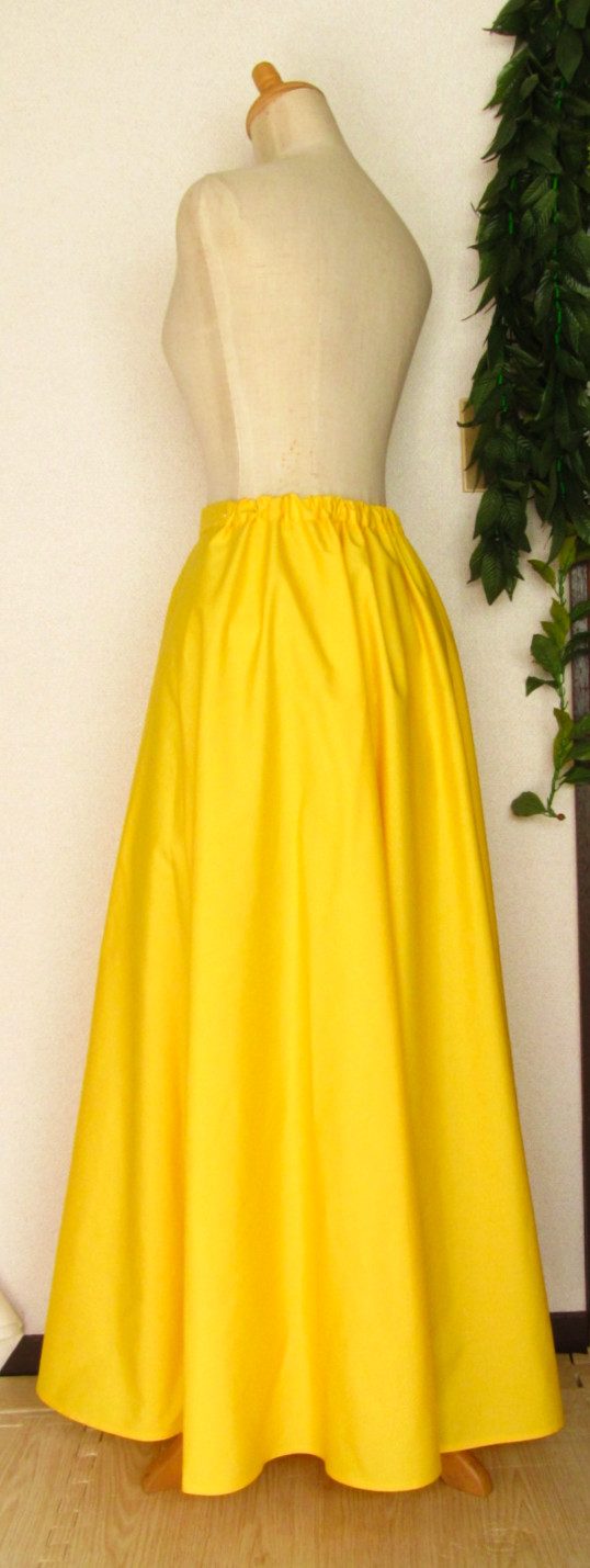 画像左より:ななめ右から、横から、後ろから(左右に広げて撮影) ![]() ![]() 画像の基本サイズを測ってみました ウエストは後ろがゴムで、調節可能なのでフリー ヌード寸法でウエスト90センチの方までなら、無理なく着ていただけます 丈はご希望のcmでお仕立てできます ウエストがとても大きい方は、前ウエストの幅をプラスできます 基本サイズの前ウエスト幅は33〜35センチ程度です。お手元のお衣装とくらべていただくか 試着用サンプルを着てみていただき、「前ウエスト横幅にプラス2センチ」などご希望のcmをお知らせください ヒップ一周・・・おおよそ160センチ程度(すべて広げるとさらにプラス10センチ程度) すそ一周・・・おおよそ300〜340センチ程度(生地幅や丈によりちがってきます) *サーキュラースカート(広げると全円に近い)ではありません すその広がりは、半円〜半円より少し広いくらいとなります