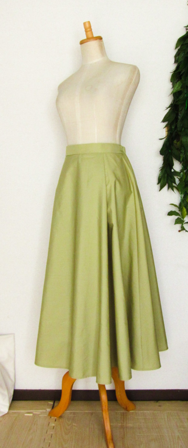 ![]() ![]() 180度のすその広がりの例です(生地幅や丈によりちがってきます) パニエやアンダースカートを使っていただけば、十分ボリュームたっぷりに着ていただけると思います もっと すその広がりが大きいほうがいい、という場合は 全円、270度などすその広がりを大きくしてお仕立てできます ご相談ください |