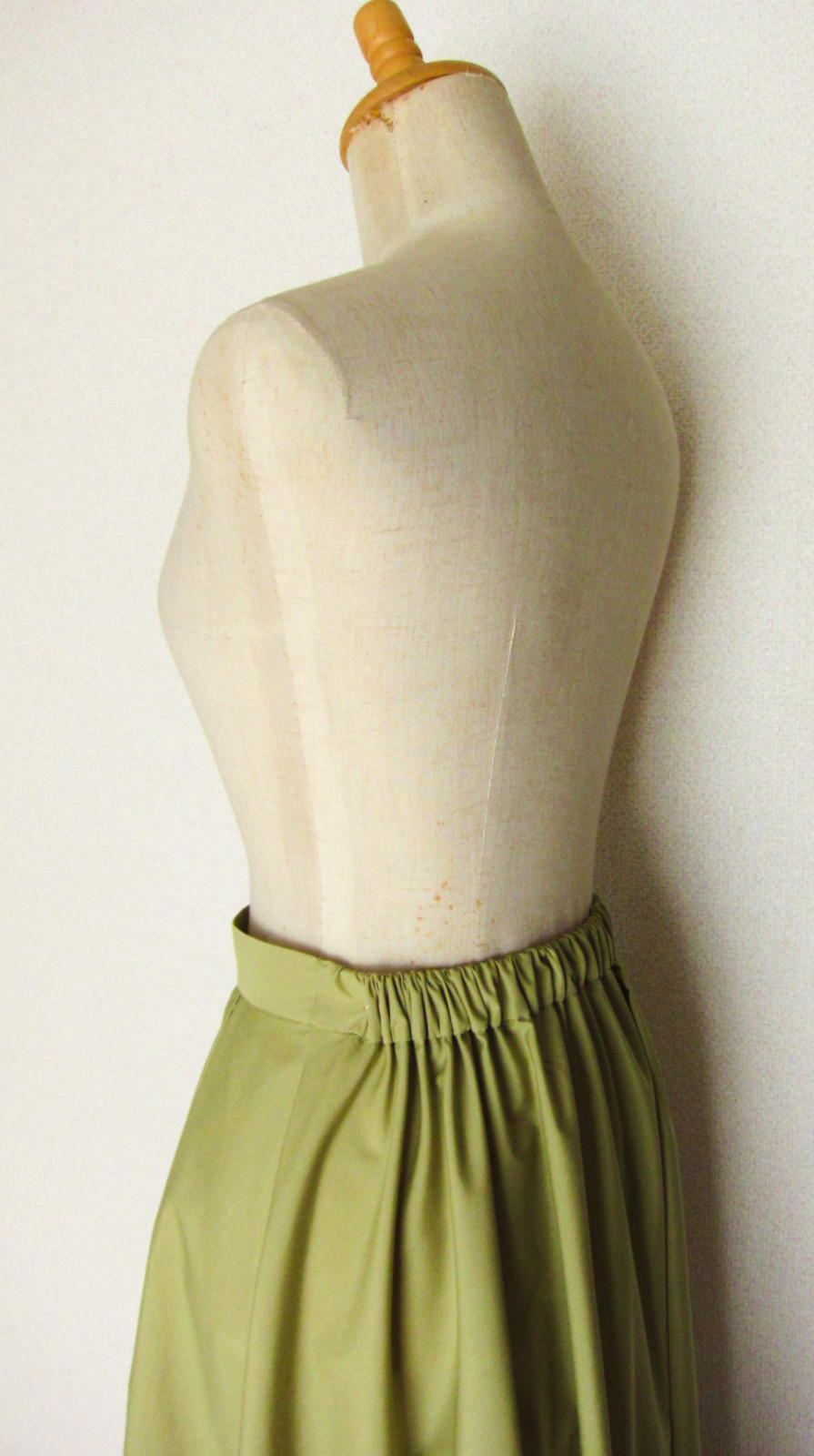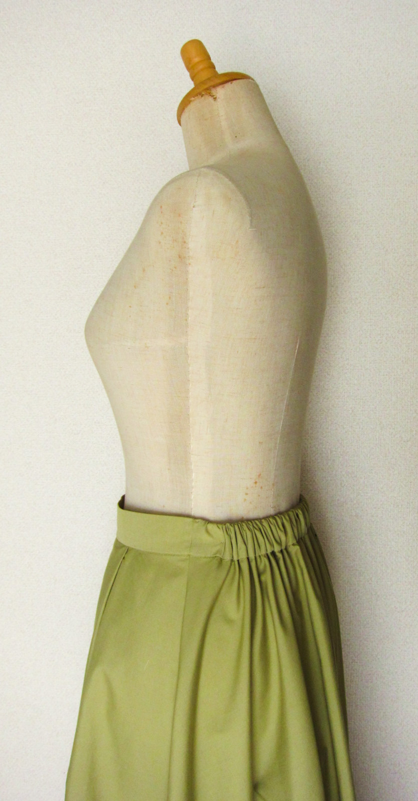 | ウエストの前にやわらかな芯を貼り、ギャザーではなくタックをたたみました ギャザー、ウエストゴムにくらべ、前からの見ためがすっきり |
