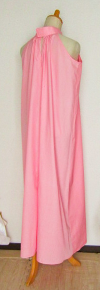 | こちらは、以前からおつくりしていたアメリカンスリーブのワンピース。ゆったりの首まわりからつながるリボンを後ろ結び。 身ごろの広がりが生地を使う方向により、2パターンあります |