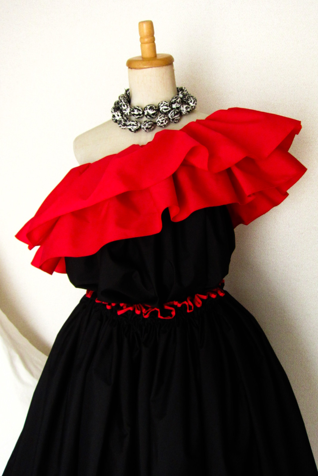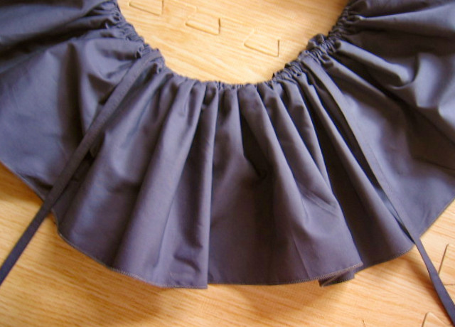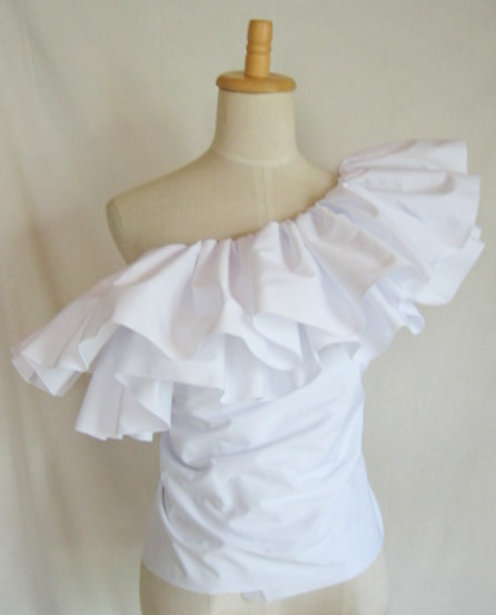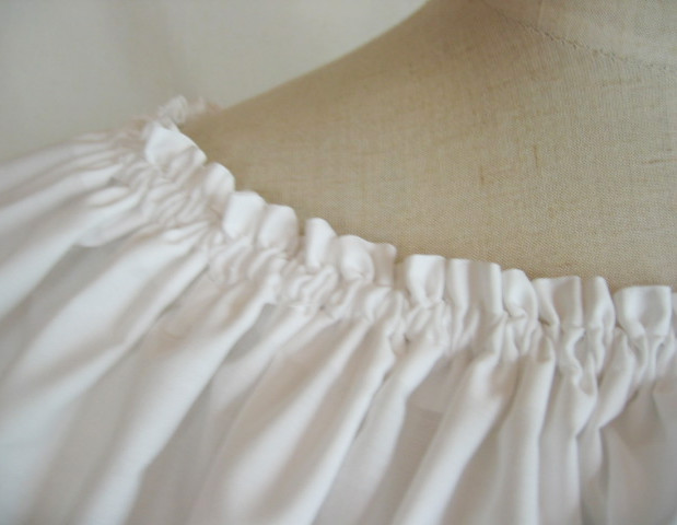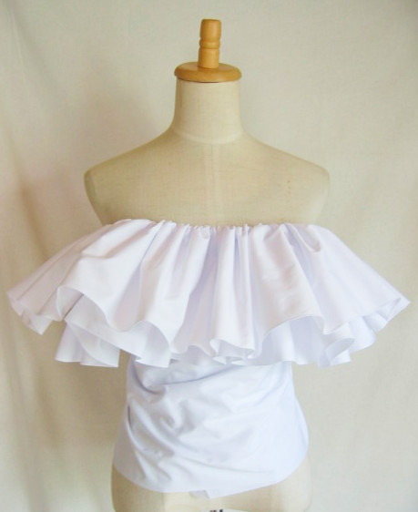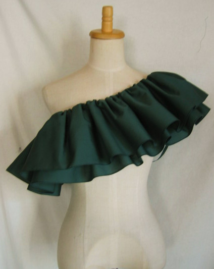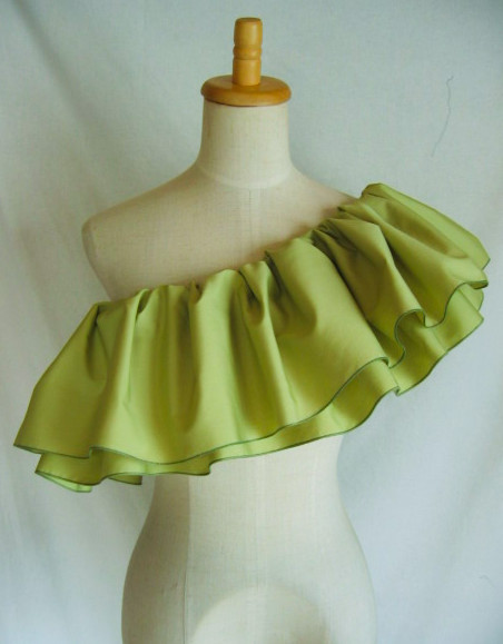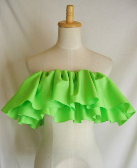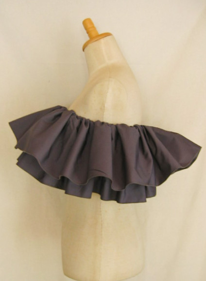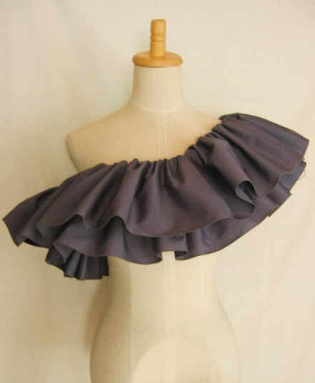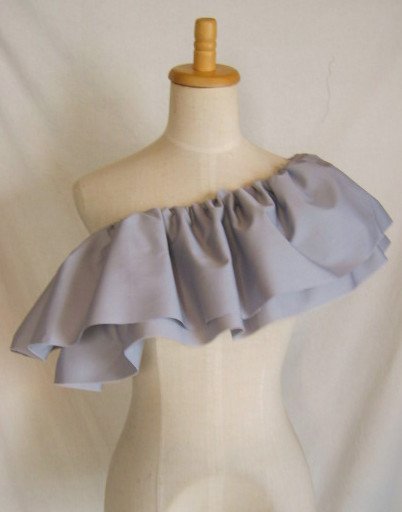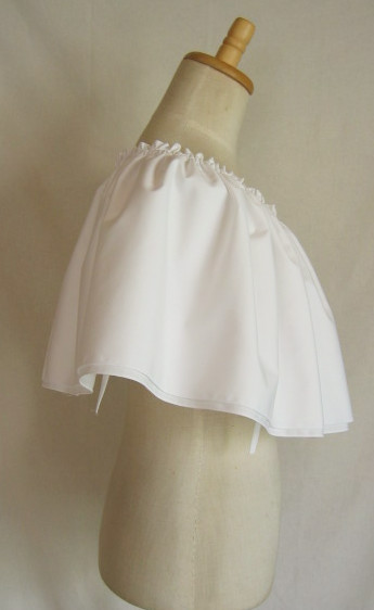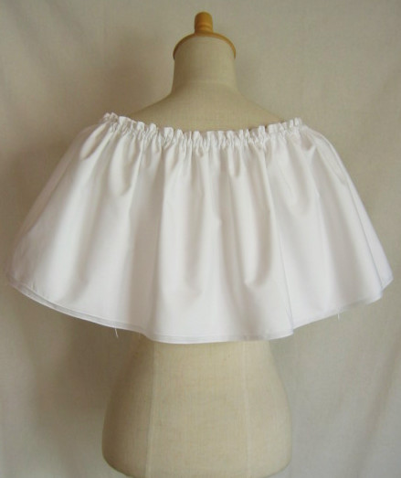 輪に縫った生地の上部にゴムを1本とおし、さっと着脱できるフリルをつくりました デコルテから肩、腕があらわになってしまう、ドレスやトップの上につけて、女性らしさとドレスアップ感を。 脇の下で結んで固定できるよう、両側にひもをお付けしているので、動きの中でもずれにくく。
