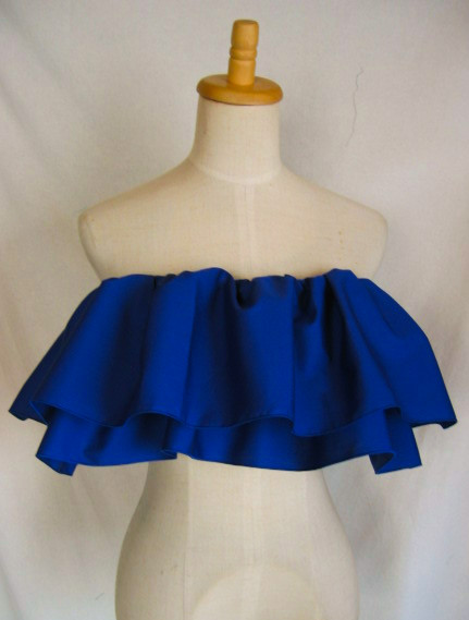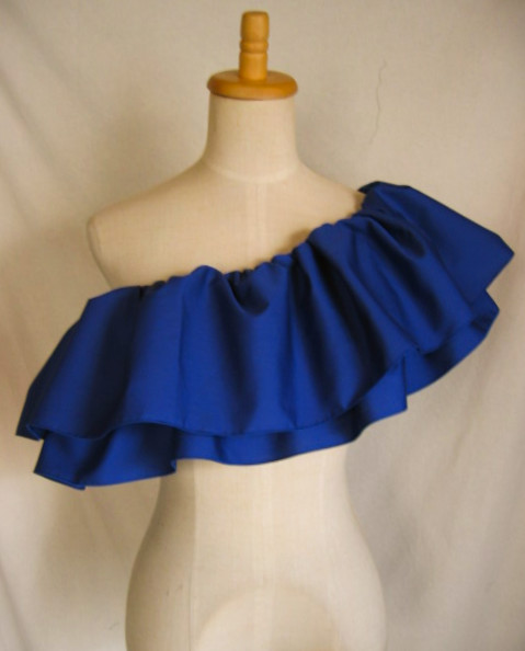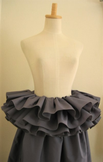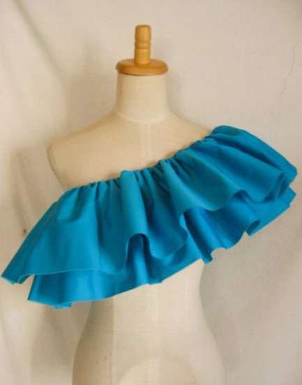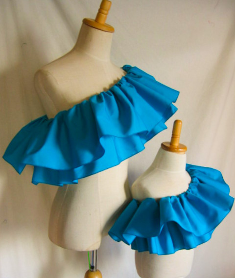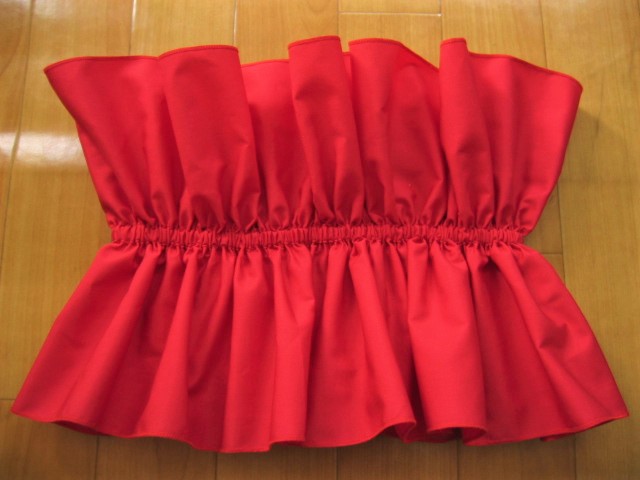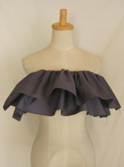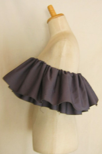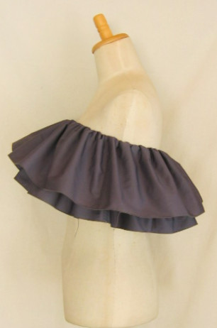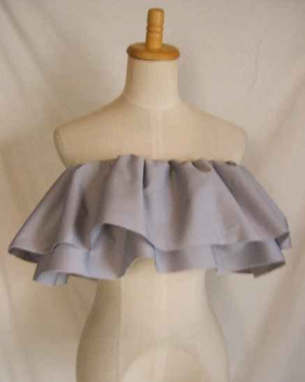 | 輪に縫った生地の真ん中にゴムを1本とおし、さっと着脱できるフリルをつくりました パウのウエストに、後ろギャザートップやシャーリングトップの上につけて、豪華にドレスアップ。 パウやトップと同じ色でも、色を変えて色合わせを生かしても。 |