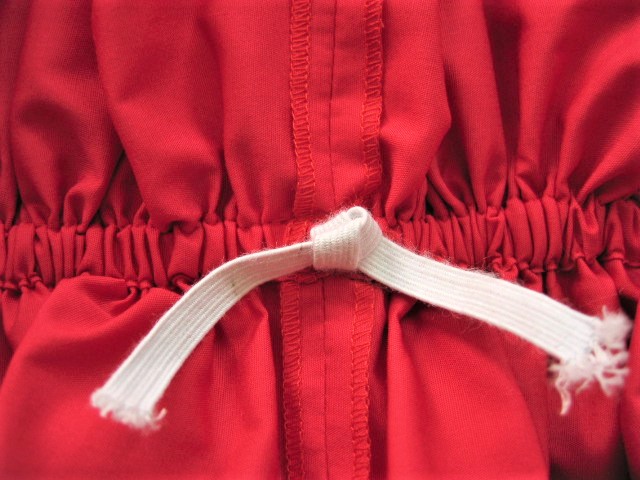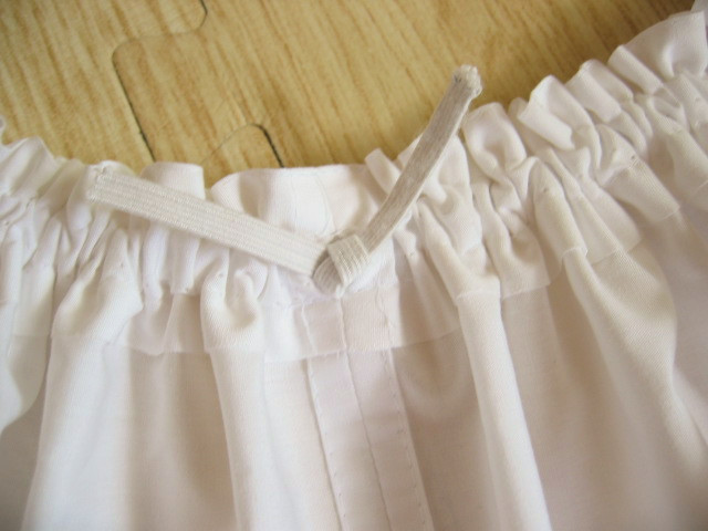 フリルの幅はご希望でおつくりできます(画像のものは16-17センチ) ゴムは長めにお入れしています、結び目がでており、おからだや着方に合わせ、調節できます |